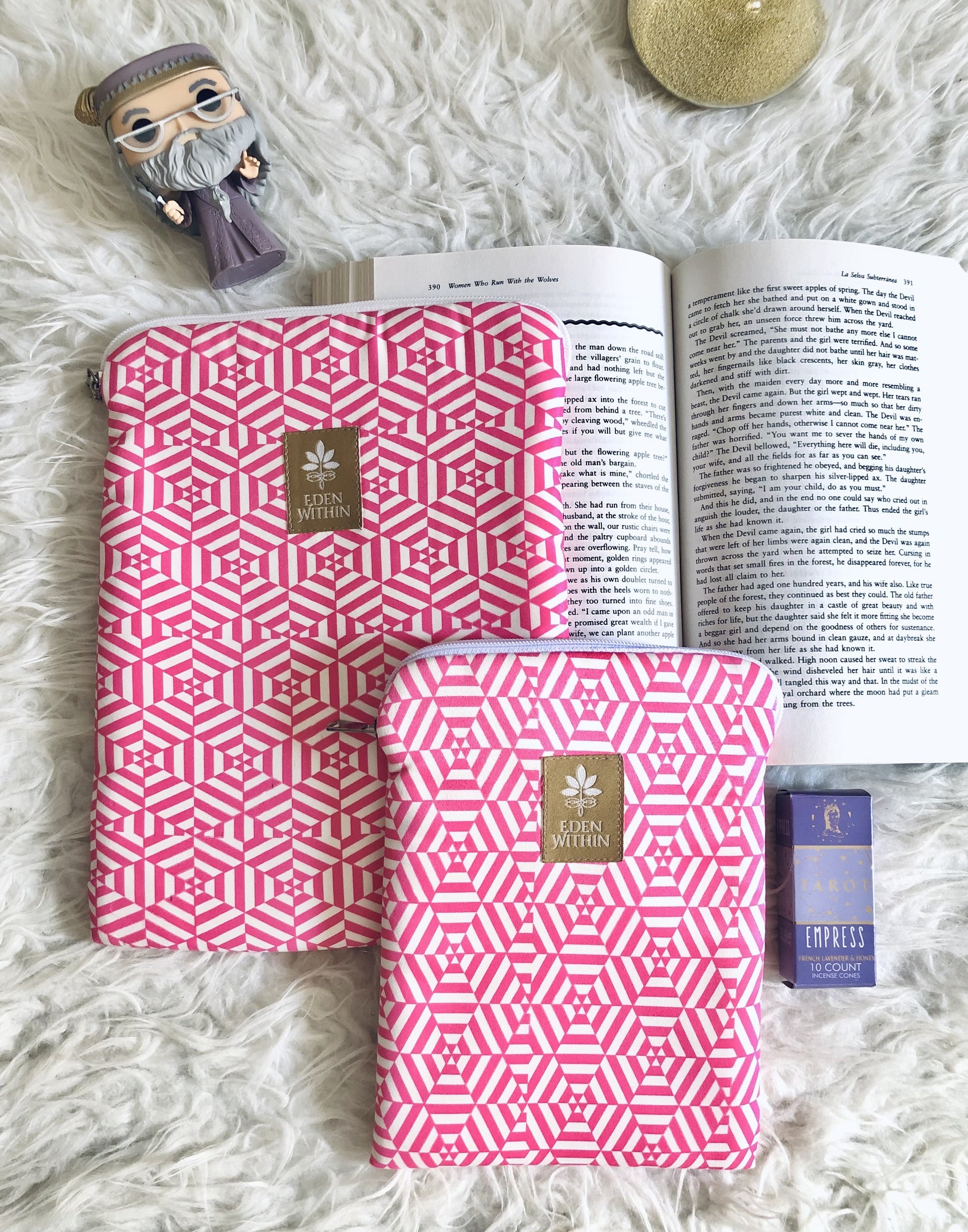 Our 'Tales in Pink' sleeves celebrates every reader’s love for beauty, comfort, and imagination. Designed with a vibrant pink geometric pattern, each book sleeve protects your favorite novels, notebooks, or journals while adding a touch of style to your daily reading ritual.